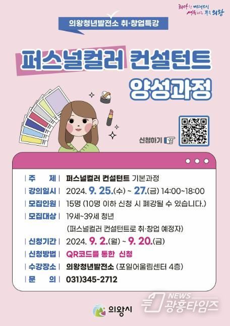 [광흥타임즈 = 구민지 기자] 의왕시는 청년들의 취·창업 기회를 다양화하기 위해 ‘퍼스널컬러 컨설턴트 양성과정’을 개설하고 9월 2일부터 20일까지 교육생을 모집한다고 밝혔다.
