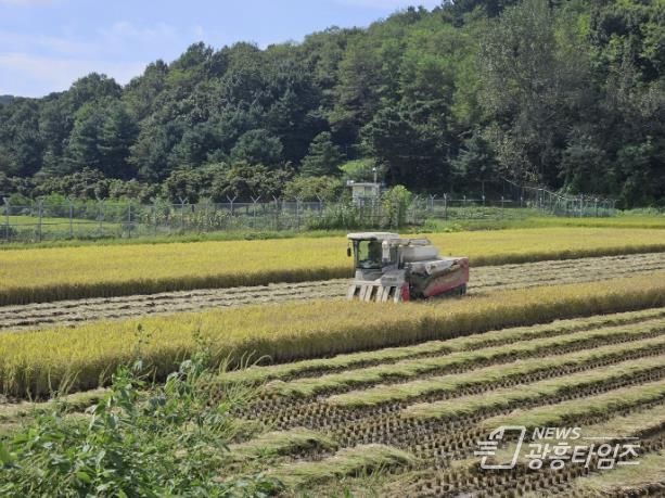 [광흥타임즈 = 조수제 기자] 시흥시는 지난 28일 도창동 일대 논에서 올해 첫 조생종 벼 수확이 이뤄졌다고 밝혔다. 이번에 수확된 벼는 진옥 벼로, 시흥시에서 지난 5월 4일 처음으로 모내기한 후 116일 만에 수확된 벼다.