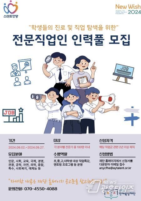 [광흥타임즈 = 조수제 기자] 안양시 인재육성재단은 9월 2일부터 27일까지 지역 학생들의 진로탐색을 지원하고, 다양한 직업 세계 경험 제공을 위한 전문직업인 인력풀을 모집한다고 4일 밝혔다.