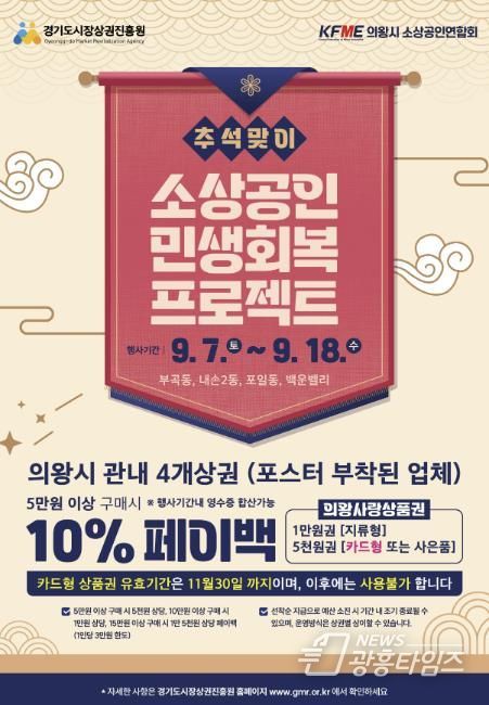 [광흥타임즈 = 구민지 기자] 의왕시소상공인연합회 및 5개 상인회는 추석을 맞아 소상공인 민생회복 프로젝트 ‘10% 페이백’ 행사를 18일까지 진행한다.