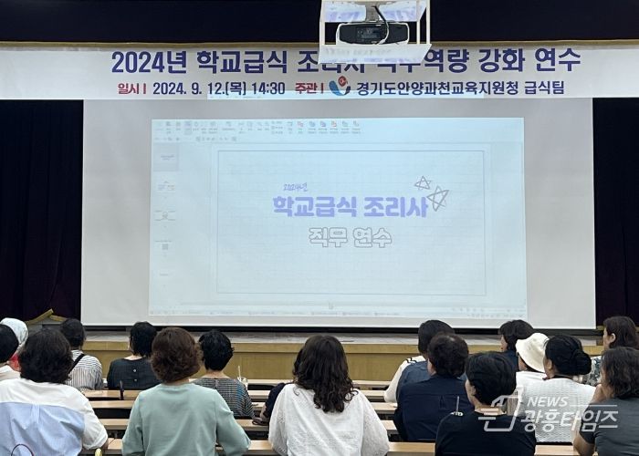 [광흥타임즈 = 조수제 기자] 경기도안양과천교육지원청은 9월 12일 경기도안양과천교육지원청 대회의실에서 관내 단설유·초·중·고·특수학교 조리사를 대상으로 2024년 학교급식 조리사 직무연수를 실시했다.