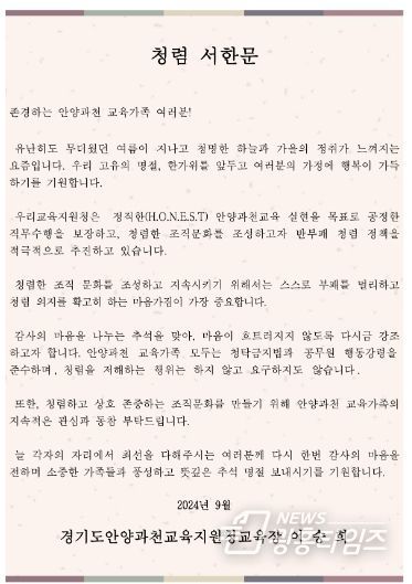 [광흥타임즈 = 조수제 기자] 경기도안양과천교육지원청은 9월 12일 경기도안양과천교육지원청 관내 학교를 대상으로 '2024 추석 명절 교육장 청렴서한문'을 발송했다.