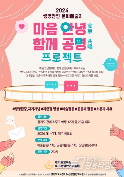 [광흥타임즈 = 조수제 기자] 경기도교육청4.16생명안전교육원이 9월부터 11월까지 관내 초·중·고등학생을 대상으로 생명안전 문화예술 교육활동 ‘마음 안녕(安寧)-함께 공명(共鳴)’ 프로그램을 운영한다.