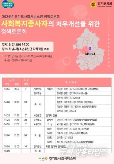 [광흥타임즈 = 조수제 기자] 오는 9월 24일 오후 2시, 하남시청소년수련관 다목적홀에서 사회복지종사자 처우개선을 주제로 한 정책토론회가 열린다. 이번 토론회는 경기도사회서비스원이 주관하고, 윤태길 경기도의원(국민의힘, 하남1)이 좌장을 맡아 진행한다.