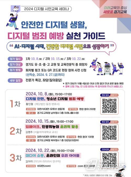이번 디지털 시민교육 세미나는 ▲디지털 안전, 청소년 디지털 범죄 예방(8일, 남부청사) ▲딥페이크, 인공지능의 윤리적 활용(15일, 북부청사) ▲미디어 소통, 온라인의 우리 아이들(22일, 비대면) 세 개의 주제로 운영된다.