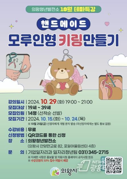 [광흥타임즈 = 구민지 기자] 의왕청년발전소에서 10월 테마특강 ‘핸드메이드 모루인형 키링만들기’수강생을 모집한다.