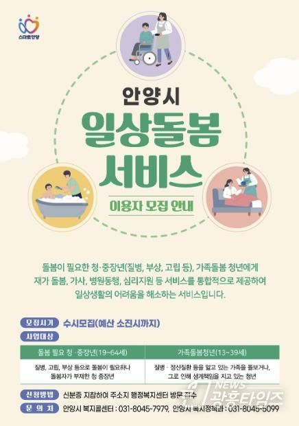 [광흥타임즈 = 조수제 기자] 안양시가 돌봄이 필요한 청·중장년(19~64세) 및 가족돌봄청년(13~39세) 대상 ‘일상돌봄서비스’의 이용자를 수시 모집 중이라고 15일 밝혔다.