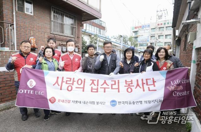 [광흥타임즈 = 구민지 기자] 롯데건설 샤롯데봉사단과 한국자유총연맹 의왕시지회는 21일 의왕시 오전동에 거주하는 저소득 장애인 가정을 방문해 집수리 봉사활동을 펼쳤다.