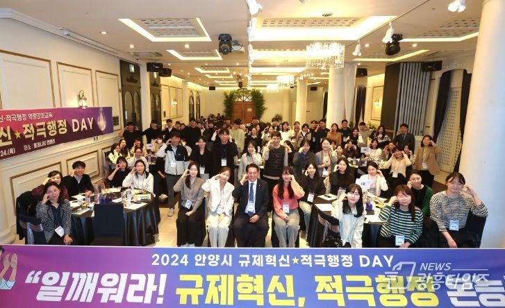 24일 오후 2시30분부터 6시까지 동안구 비산동 트리니티컨벤션에서 안양시 공무원 90여명이 참석한 가운데 ‘2024년 규제혁신・적극행정 역량강화 교육’이 진행됐다.