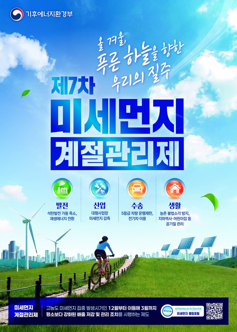 시는 12월부터 내년 3월까지 ‘제7차 미세먼지 계절관리제’를 시행한다고 1일 밝혔다. 미세먼지 계절관리제는 겨울철 고농도 미세먼지에 대비하는 저감 대책으로 미세먼지 고농도 발생빈도와 강도를 줄이는 제도이다.
