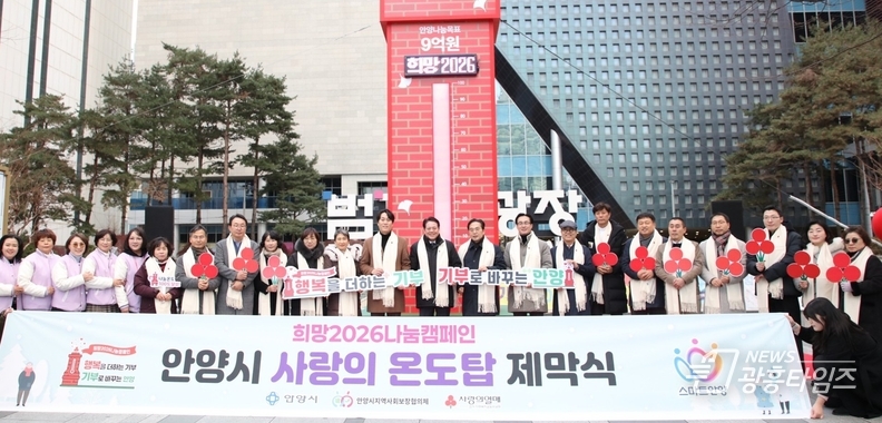 [광흥타임즈 = 조수제 기자] 안양시는 지난 4일 범계역 광장에서 ‘희망 2026 나눔 캠페인 사랑의 온도탑’ 제막식을 열고, 모금 목표 9억원을 향한 연말 이웃돕기 캠페인의 막을 올렸다고 5일 밝혔다.