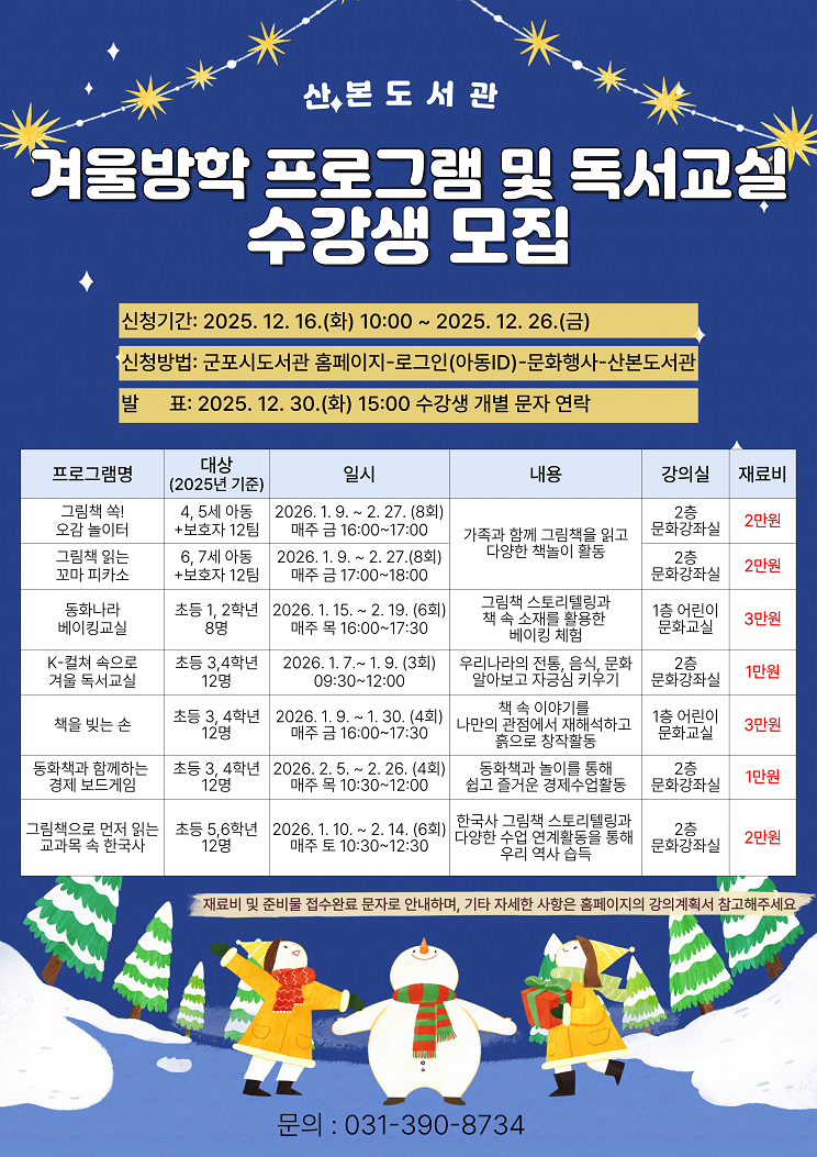 [광흥타임즈 = 조수제 기자] 산본도서관은 겨울방학을 맞아 유아 및 초등학생 대상 겨울방학 독서진흥 프로그램 및 독서교실을 오는 1월 7일부터 2월 27일까지 운영한다.