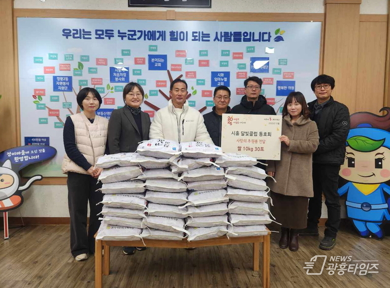 [광흥타임즈 = 조수제 기자] 시흥시 정왕동을 기반으로 활동하고 있는 달빛클럽 동호회가 지난 12월 9일 연말을 앞두고 지역 내 어려운 이웃을 위한 쌀 10kg 30포(총 300kg)를 정왕2동 행정복지센터에 기부했다.