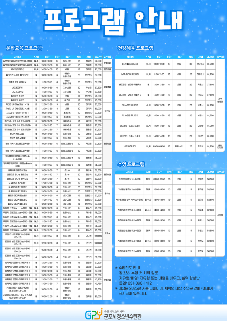 [광흥타임즈 = 조수제 기자] (재)군포시청소년재단 군포시청소년수련관은 2026년 1월 12일부터 2월 28일까지 겨울방학을 맞아 문화·체육 분야 겨울방학특강 프로그램을 운영한다.