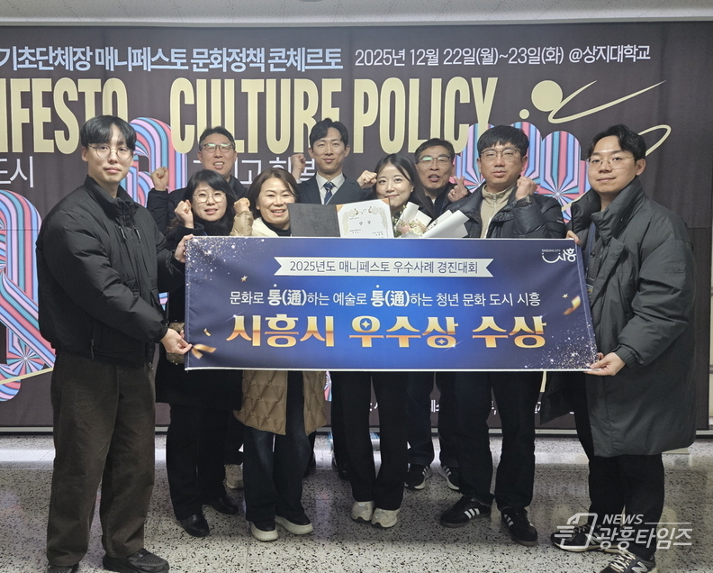 [광흥타임즈 = 조수제 기자] 시흥시는 사)한국매니페스토실천본부가 지난 12월 22일부터 23일까지 주관한 ‘2025 전국 기초단체장 매니페스토 문화정책 콘체르토’ 문화 활동 활성화 분야에서 우수상을 받았다. 이번 수상으로 시흥시는 실천 중심의 정책 추진력과 행정 성과를 대외적으로 인정받게 됐다.