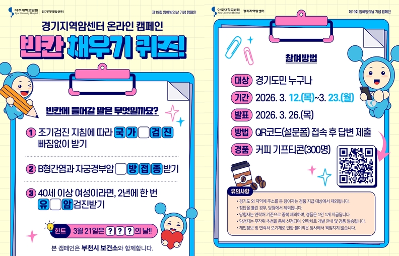 경기지역암센터가 주최하는 ‘제19회 암 예방의 날 기념 빈칸 채우기 퀴즈’는 3월 12일부터 3월 23일까지 진행되며 경기도민 누구나 참여할 수 있다.