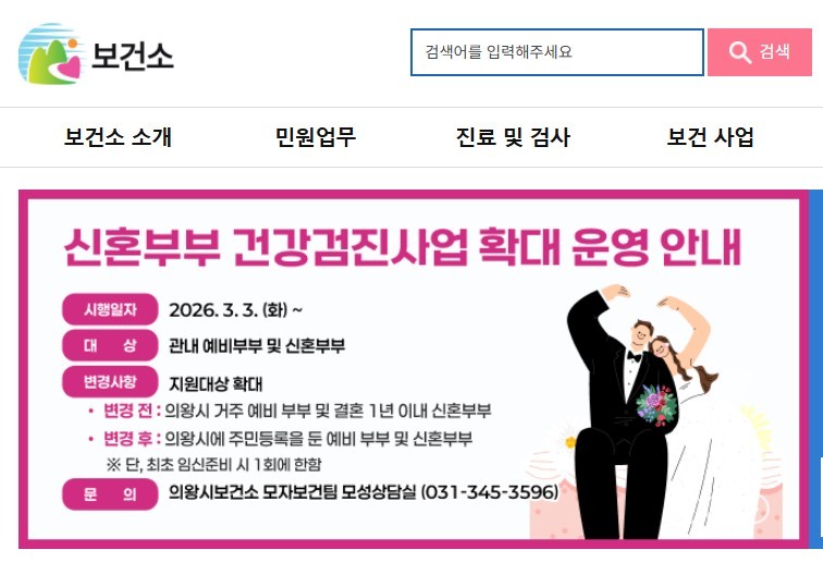 [광흥타임즈 = 구민지 기자] 의왕시 보건소가 저출산 문제를 극복하고 신혼부부의 건강한 시작을 지원하기 위해 ‘신혼부부 및 예비부부 건강검진’ 사업을 확대 추진한다.
