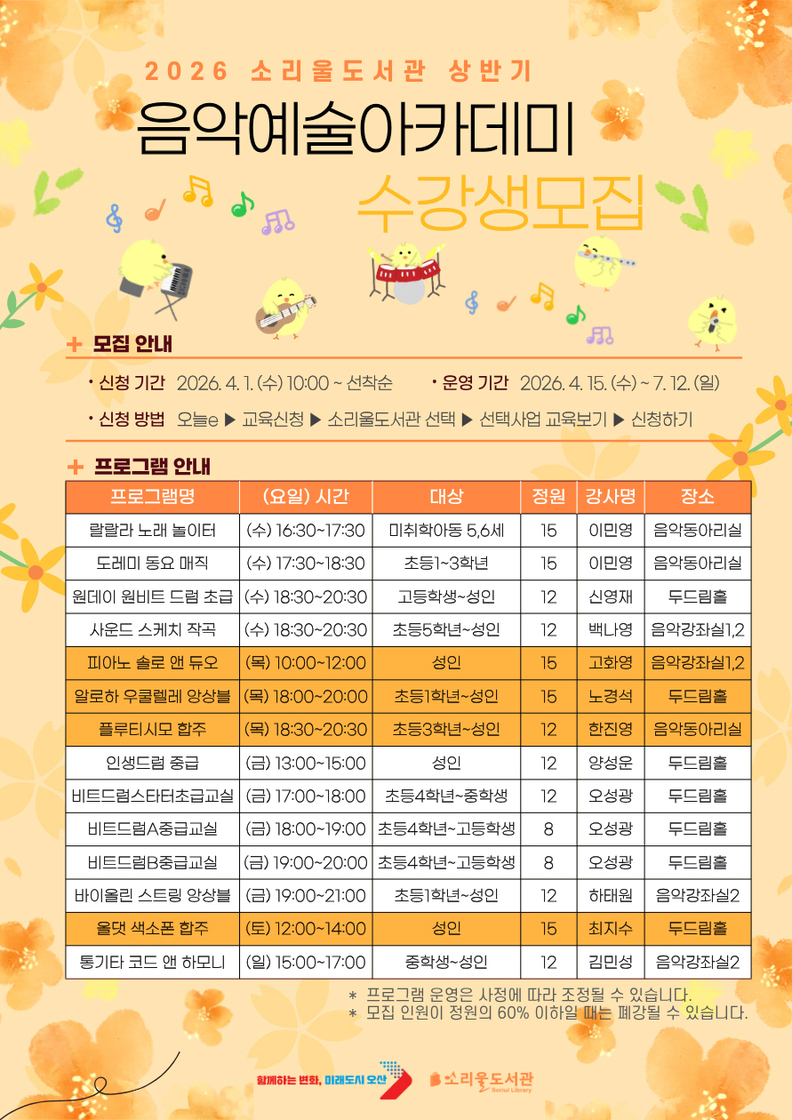 [광흥타임즈 = 조수제 기자] 오산시 소리울도서관은 시민들의 예술적 감수성을 높이고 일상 속 음악 문화를 확산하기 위해 ‘2026년 소리울도서관 상반기 음악예술아카데미’ 수강생을 모집한다고 밝혔다.
