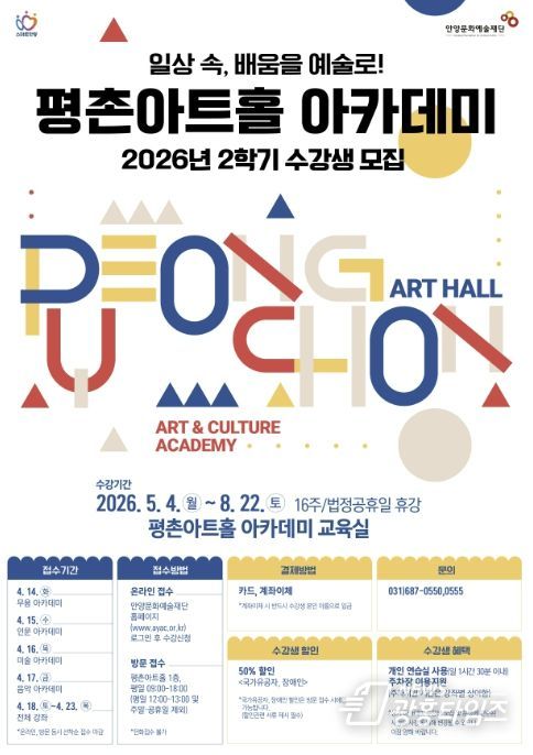 [광흥타임즈 = 조수제 기자] 안양문화예술재단은 시민 누구나 문화예술을 자유롭게 접하고 즐겁게 배울 수 있도록 오는 4월 14일부터 23일까지 ‘2026년 평촌아트홀 아카데미’ 2학기 수강생을 모집한다.