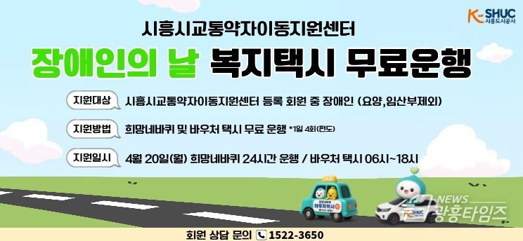 [광흥타임즈 = 조수제 기자] 시흥도시공사는 오는 4월 20일 ‘제46회 장애인의 날’을 맞아 교통약자의 이동 편의 증진과 사회참여 확대를 위해 무료 운행 서비스를 제공한다고 밝혔다.