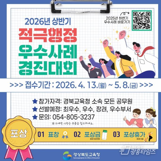 [광흥타임즈 = 조수제 기자] 경북교육청은 능동적이고 창의적인 공직문화를 조성하고 교육 현장의 변화를 이끈 우수 사례를 발굴하기 위해 ‘2026년 상반기 적극행정 우수 사례 경진대회’를 개최한다고 15일 밝혔다.