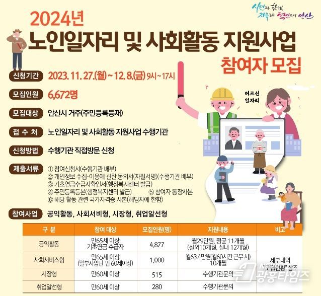 [광흥타임즈 = 조수제 기자] 안산시는 ‘2024년 노인일자리 및 사회활동 지원사업’ 참여자 6천672명을 다음달 8일까지 모집한다고 27일 밝혔다.