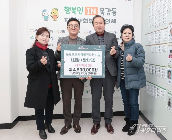 [광흥타임즈 = 조수제 기자] 동사모(동전으로 사랑을 전하는 모임)가 지난 24일 목감동 행정복지센터를 방문해 지역 내 어려운 이웃을 위해 매월 20만 원씩 2년간 총 480만 원을 기탁하기로 했다.