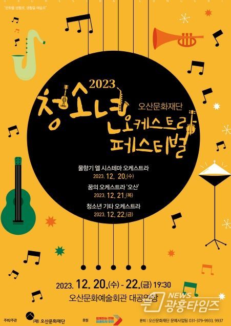 [광흥타임즈 = 조수제 기자] (재)오산문화재단은 오는 12월20일~ 22일까지 3일간 오산문화예술회관 대공연장에서 ”2023 오산 청소년 오케스트라 페스티벌“을 개최한다고 밝혔다. 이번 페스티벌은 오케스트라 활동을 희망하는 오산 관내의 청소년을 모집하여 일 년간 전문 음악강사의 지도와 무상악기대여를 통해 갈고 닦은 노력의 성과를 발표하는 정기연주회 공연이 펼쳐질 예정이다.