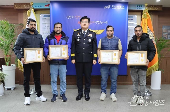 [광흥타임즈 = 조수제 기자] 경기도북부소방재난본부 포천소방서는 11일 오후 서장 집무실에서 차량화재 현장에서 생명을 구한 방글라데시 국적의 사카르 고팔(35)씨 등 4명에게 소방서장 표창을 수여했다.