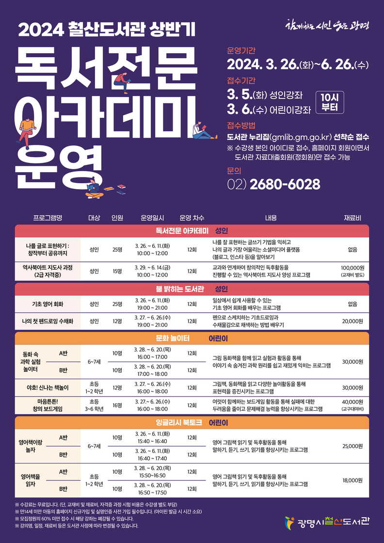 [광흥타임즈 = 조수제 기자] 광명시 철산도서관은 ‘2024년 상반기 독서전문 아카데미’ 9개 강좌 수강생을 선착순으로 모집한다.