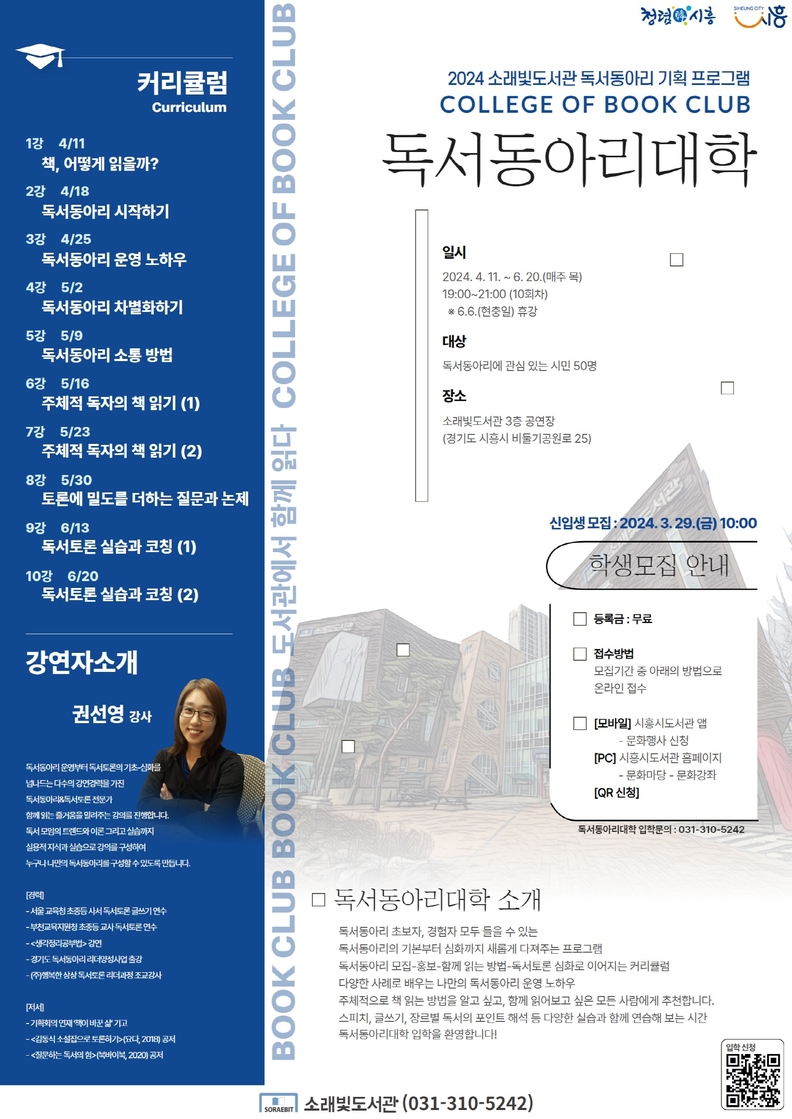 [광흥타임즈 = 조수제 기자] 시흥시 소래빛도서관은 4월 11일부터 6월 20일까지 함께 책 읽는 즐거움을 알려줄 ‘독서동아리 대학’ 프로그램을 매주 목요일 오후 7시부터 소래빛도서관 3층 공연장에서 운영한다. 이 프로그램에는 독서와 동아리에 관심 있는 시민이라면 누구나 참여할 수 있다.