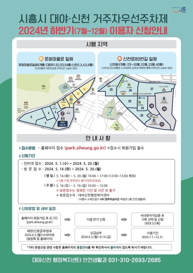 하반기 대야ㆍ신천 거주자우선주차제 신청은 인터넷과 방문 신청으로 진행된다. 인터넷 신청은 시흥시 대야ㆍ신천 거주자우선주차 누리집에서 5월 1일부터 20일까지 할 수 있으며, 방문 신청은 5월 14일부터 20일까지 대야ㆍ신천 행정복지센터 안전생활과로 직접 방문해서 신청해야 한다.