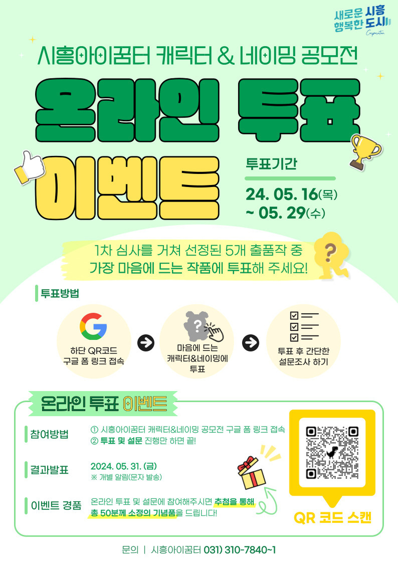 [광흥타임즈 = 조수제 기자] 시흥도시공사는 5월 29일까지 ‘시흥아이꿈터 캐릭터 및 네이밍 공모전’에 대한 시민 온라인 투표를 실시한다고 17일 밝혔다.