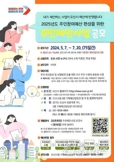 [광흥타임즈 = 조수제 기자] 오산시는 오는 7월 20일까지 2025년 예산에 반영할 주민참여예산 제안사업 집중 공모를 실시한다고 밝혔다.
