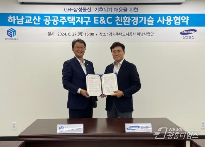 [광흥타임즈 = 조수제 기자] 경기주택도시공사(GH)는 27일 하남시 GH하남사업단에서 기후 위기 대응을 위한 탄소중립 정책에 적극 부응하기 위해 삼성물산과 ‘무시멘트’ 보도블록 적용을 위한 탄소 저감 건설자재 사용 협약을 체결했다고 밝혔다.