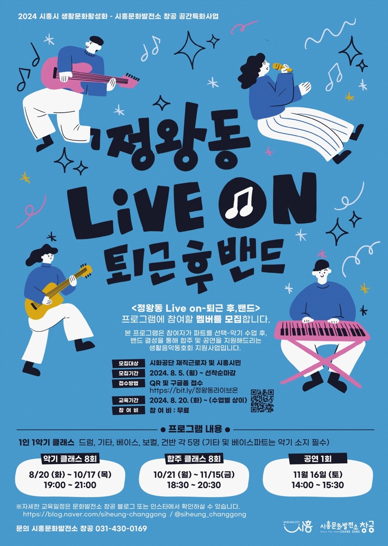 [광흥타임즈 = 조수제 기자] 시흥시가 오는 20일부터 3개월간 시흥문화발전소 창공에서 ‘정왕동 Live on-퇴근 후, 밴드 시즌2’를 운영한다.