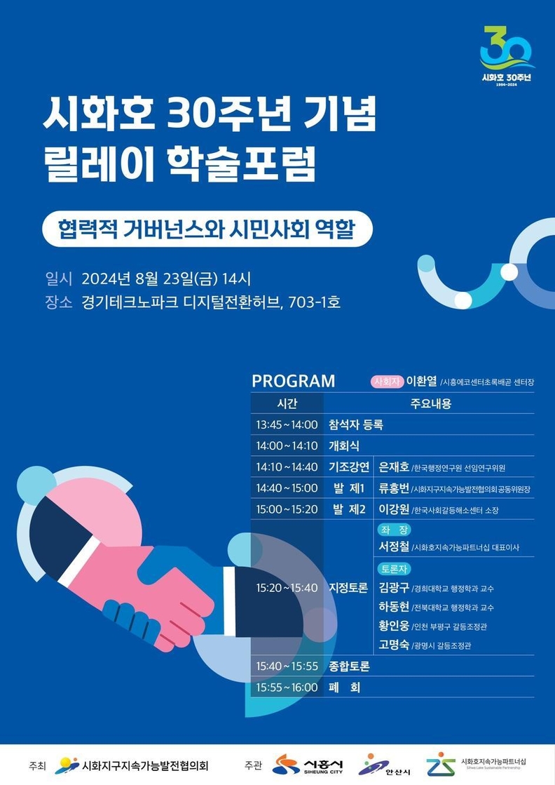 포럼은 은재호 한국행정연구원 선임연구원의 기조 강연을 시작으로 ▲시화지구지속가능발전협의회 류홍번 공동위원장과 ▲한국사회갈등해소센터 이강원 소장의 발제와 시화호의 협력적 거버넌스와 시민사회 역할에 대한 심도 있는 토론이 이뤄질 예정이다.