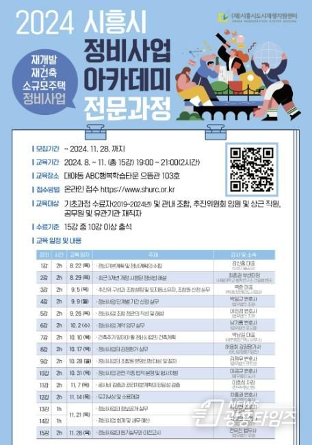 [광흥타임즈 = 조수제 기자] 시흥시와 (재)시흥시도시재생지원센터가 올해 상반기 정비사업 아카데미 기초과정에 이어 하반기에도 ‘정비사업 아카데미 전문과정’을 개설한다. 이번 교육은 전문가를 초청해 정비사업에 대한 이해도를 높이기 위해 마련됐다.