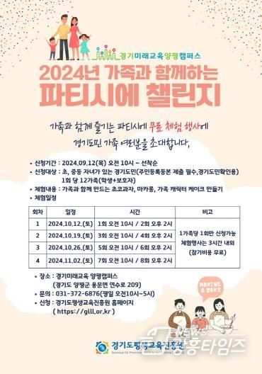 참여 신청은 9월 12일 오전 10시부터 경기도평생교육진흥원 누리집 통해 가능하며 경기도민 확인을 위해 주민등록등본을 제출해야 한다. 접수는 선착순 96가정 모집 시 마감된다.