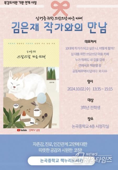 김은재 작가와의 만남 ‘십대를 위한, 쓰담쓰담 마음카페’는 논곡중학교 3학년 학생들을 대상으로 자존감, 진로, 인간관계 고민에 대한 따뜻한 공감과 시원한 코칭 내용의 강의로 이뤄지며 논곡중학교 시청각실에서 진행된다.