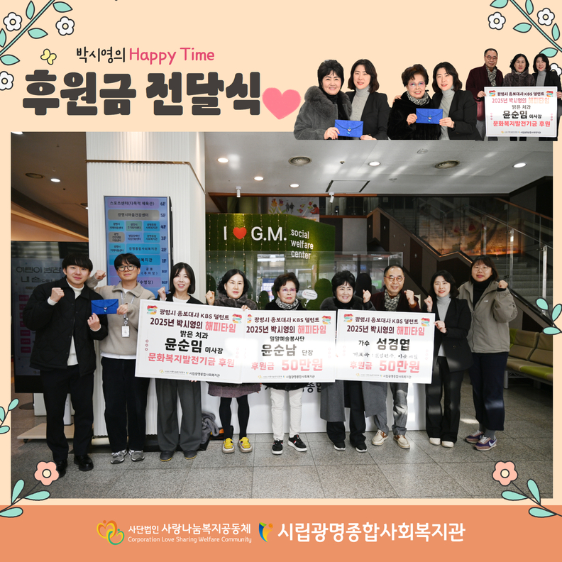 후원금 전달식에서는 밀알예술봉사단의 윤순남 단장이 500,000원을, 가수 성경엽(대표곡: "일엽편주")이 500,000원을 기부하였으며, 밝은치과의 윤순임 이사장이 문화복지발전기금을 후원하여 2025년 박시영의 Happy Time 행사를 응원했다.