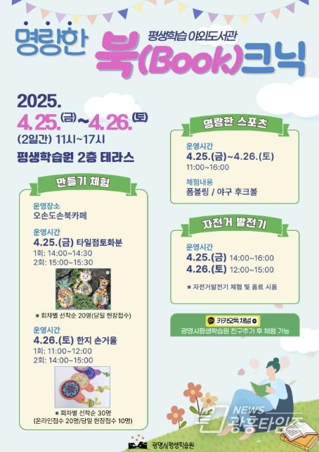 [광흥타임즈 = 조수제 기자] 광명시 평생학습원은 오는 25일부터 26일까지 이틀간 평생학습원 2층 테라스와 오손도손 북카페 등에서 2025년 상반기 평생학습 야외도서관 ‘명랑한 북(Book)크닉’을 운영한다.