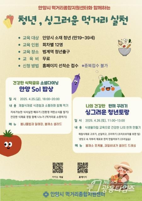 [광흥타임즈 = 조수제 기자] 안양시 먹거리종합지원센터는 청년대상 식생활 자립실천 지원을 위해 먹거리로 건강하게 소통하는 소셜다이닝 ‘안양 Sol 공유밥상’ 과 건강한 식사 챙기기 조리실천 교육 ‘싱그러운 청년토랑’ 상반기 프로그램을 본격적으로 시작한다고 25일 밝혔다.