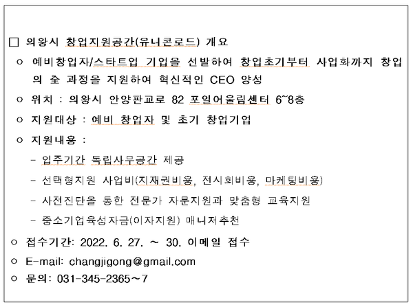 [의왕=구민지 기자] 의왕시 창업지원공간에서 유니콘 기업을 육성하기 위한 신규 입주기업 모집을 진행한다고 9일 밝혔다.