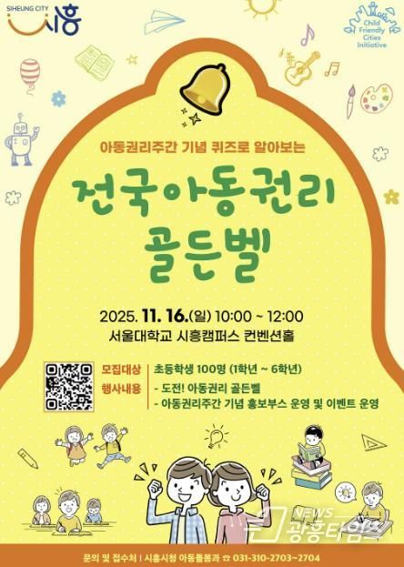 [광흥타임즈 = 조수제 기자] 시흥시는 오는 11월 16일 오전 10시, 서울대학교 시흥캠퍼스 컨벤션홀에서 열리는 ‘퀴즈로 알아보는 전국 아동권리 골든벨’에 참가할 초등학생을 10월 31일까지 모집한다.