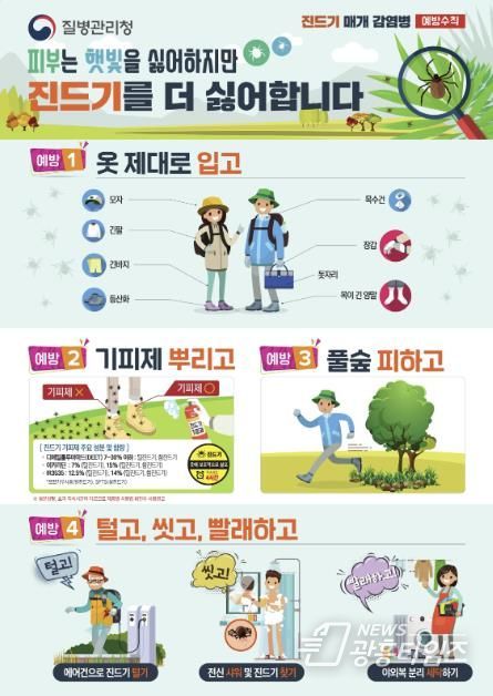진드기 매개 감염병 예방을 위해서는 ▲야외 활동 시 진드기 기피제 사용 및 긴소매·긴바지·모자 등 착용으로 피부 노출 최소화 ▲야외활동 후 즉시 샤워 및 옷 갈아입기 ▲얼굴, 귀, 몸통 등에 진드기 부착 여부 확인 등의 수칙을 지켜야 한다.