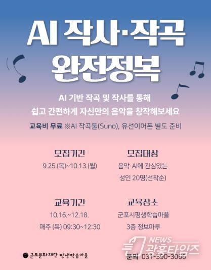 [광흥타임즈 = 조수제 기자] 군포시평생학습마을이 4차 산업혁명 시대의 핵심 기술인 인공지능(AI)을 활용한 예술 창작교육을 선보인다. 오는 10월 16일부터 12월 18일까지 매주 목요일 진행되는 'AI 작사·작곡 완전정복' 강좌는 시민이 디지털 기술을 활용해 직접 노래를 만들고, 음악을 통해 창의력을 확장할 수 있도록 기획됐다.