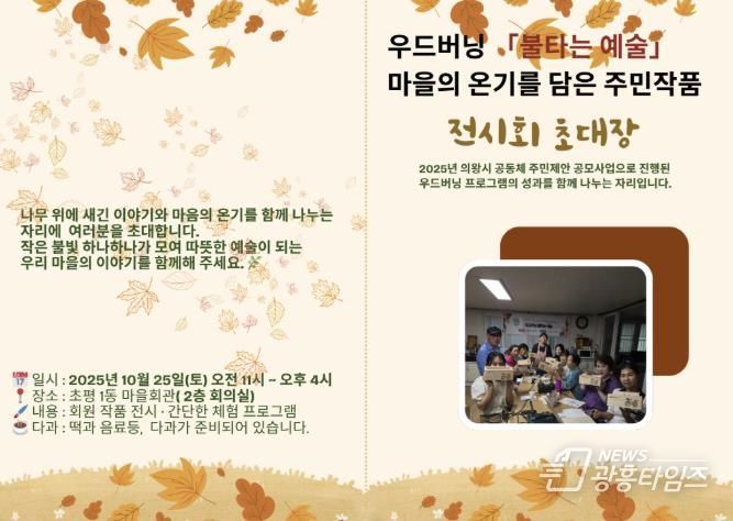 [광흥타임즈 = 구민지 기자] 의왕시는 마을공동체 자강불식이 오는 10월 25일 초평1동마을회관(윗새우대북길 14)에서'우드버닝, 불타는 예술'작품전시회를 개최한다고 밝혔다.