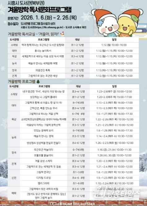 [광흥타임즈 = 조수제 기자] 시흥시는 겨울방학을 맞아 북부권 8개 공공도서관(소래빛ㆍ대야ㆍ목감ㆍ능곡ㆍ장곡ㆍ은계ㆍ신천ㆍ매화)에서 1월 6일부터 2월 26일까지 겨울독서교실 및 겨울방학 프로그램을 운영한다.