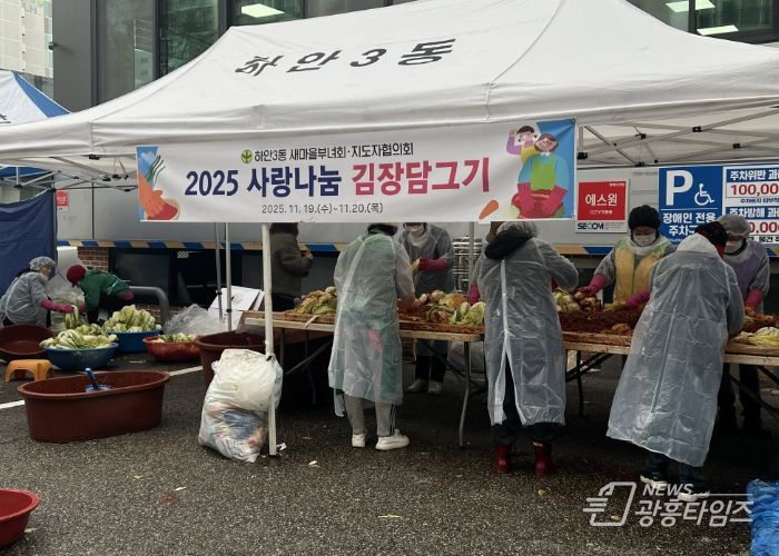 [광흥타임즈 = 조수제 기자] 광명시 하안3동 새마을부녀회와 새마을지도자협의회는 지난 19일부터 20일까지 이틀간 하안3동 행정복지센터 앞 주차장에서 ‘사랑나눔 김장 담그기’ 행사를 열었다.